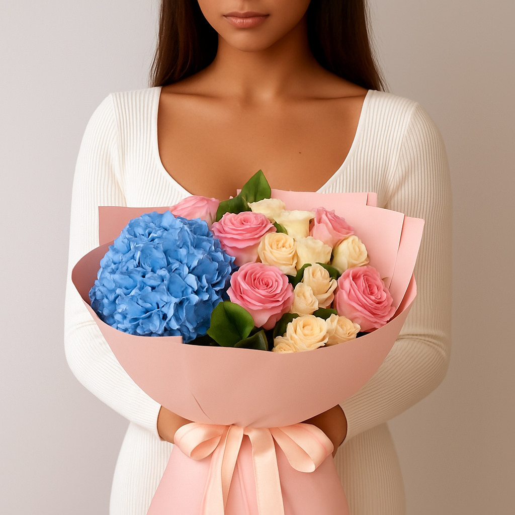 Элегантный букет в нежных пастельных тонах, наполненный гармонией и изысканностью. Сочетание воздушной голубой гортензии, нежных розовых и кремовых роз создает атмосферу утончённости и свежести. Такой букет станет прекрасным подарком для выражения самых искренних чувств и ярких эмоций.
