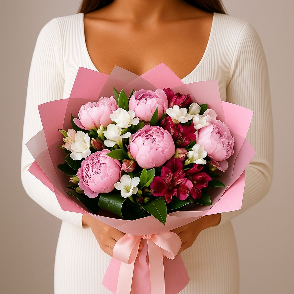 Очаровательный букет, наполненный свежестью и изяществом. Нежные пионы, в сочетании с благородными лилиями и воздушными альстромериями создают гармоничную композицию, которая подарит атмосферу утончённости и нежности. Такой букет станет прекрасным подарком для особого случая или просто для выражения искренних чувств.