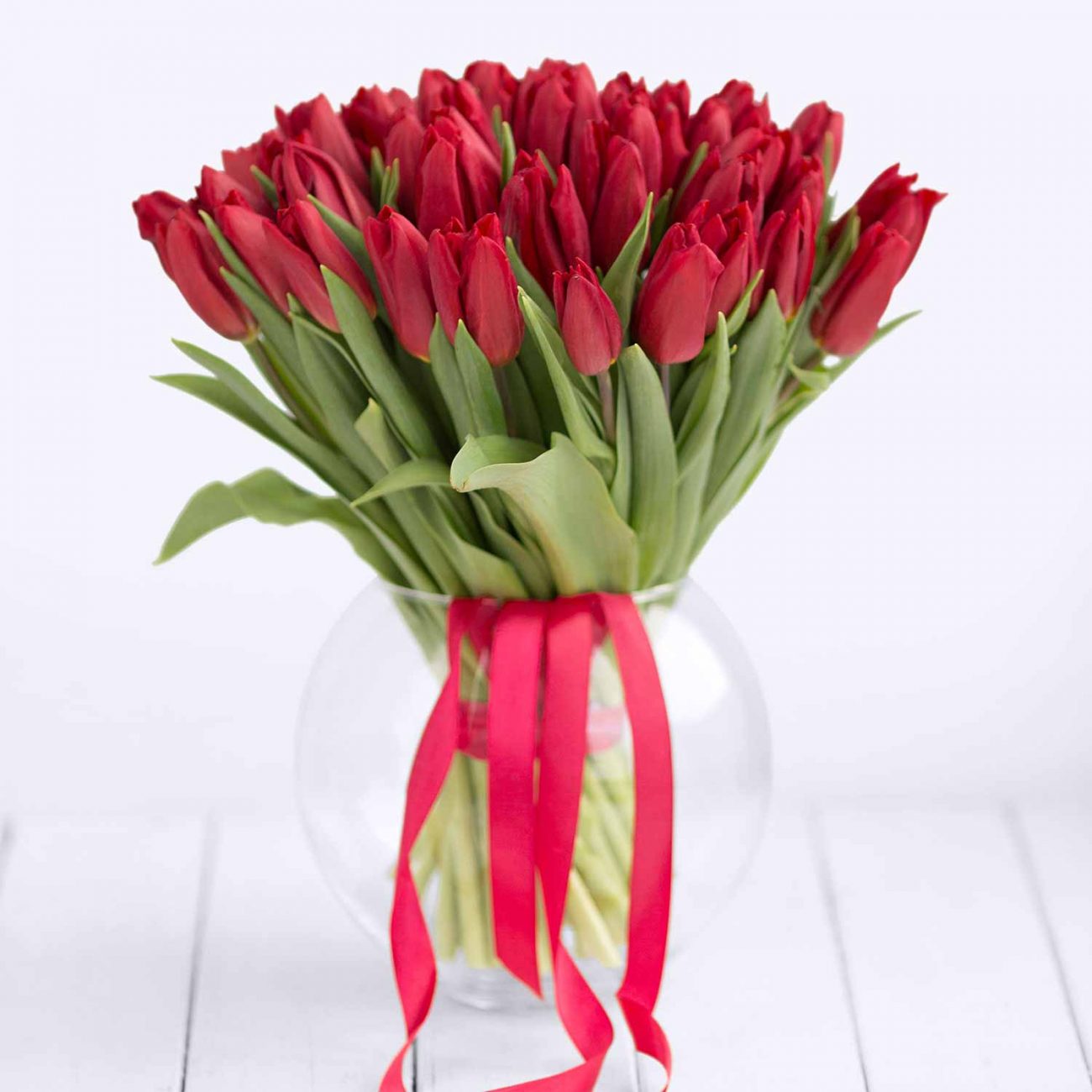 Букет красных тюльпанов под ленту — 51 штука