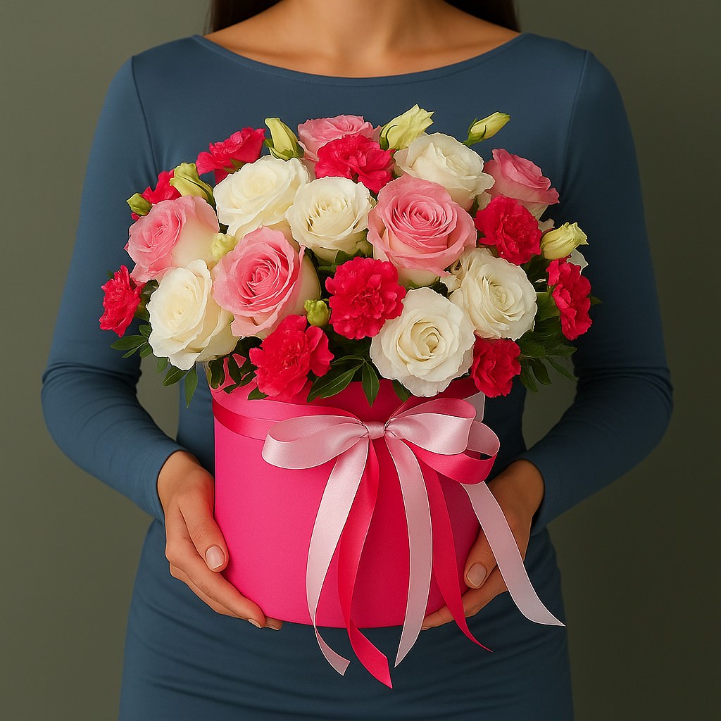 Яркая композиция с розами и гвоздиками создаёт атмосферу праздника и романтики. Идеально подойдёт для признаний в любви и незабываемых моментов.