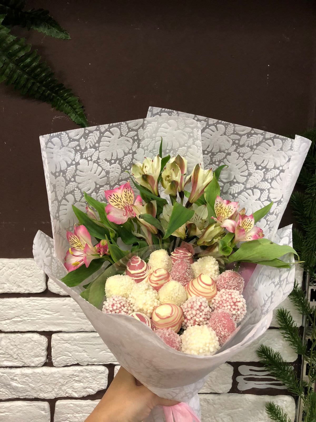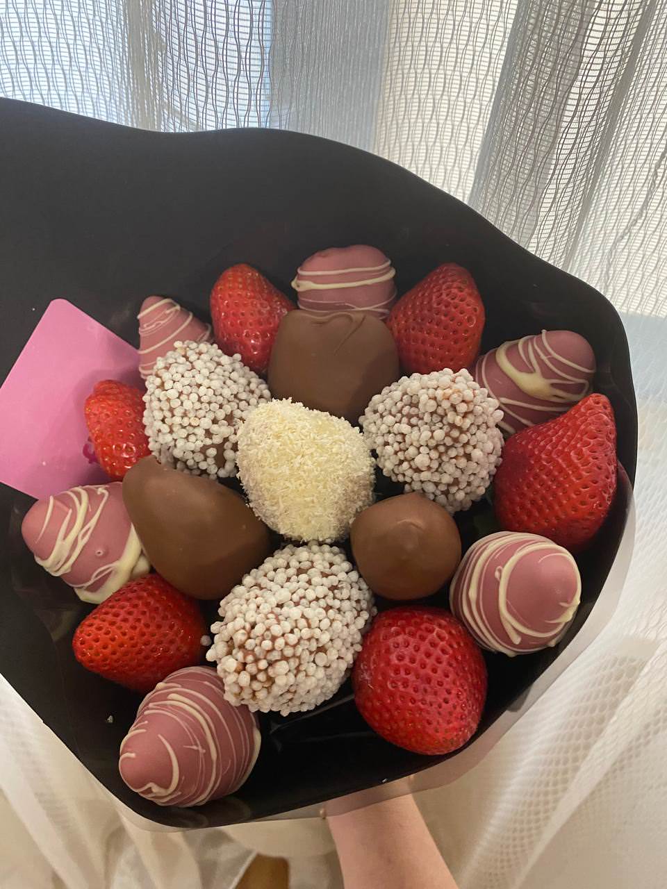 Очень качественный букет,жена в восторге. Шоколад настоящий, суперская клубника. Заказывал к 8 марта, отличная служба доставки. Однозначно рекомендую!